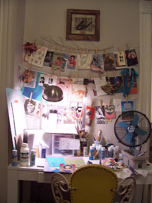 The space above my desk has become a revolving inspiration board, made possible by clothesline and pins.
